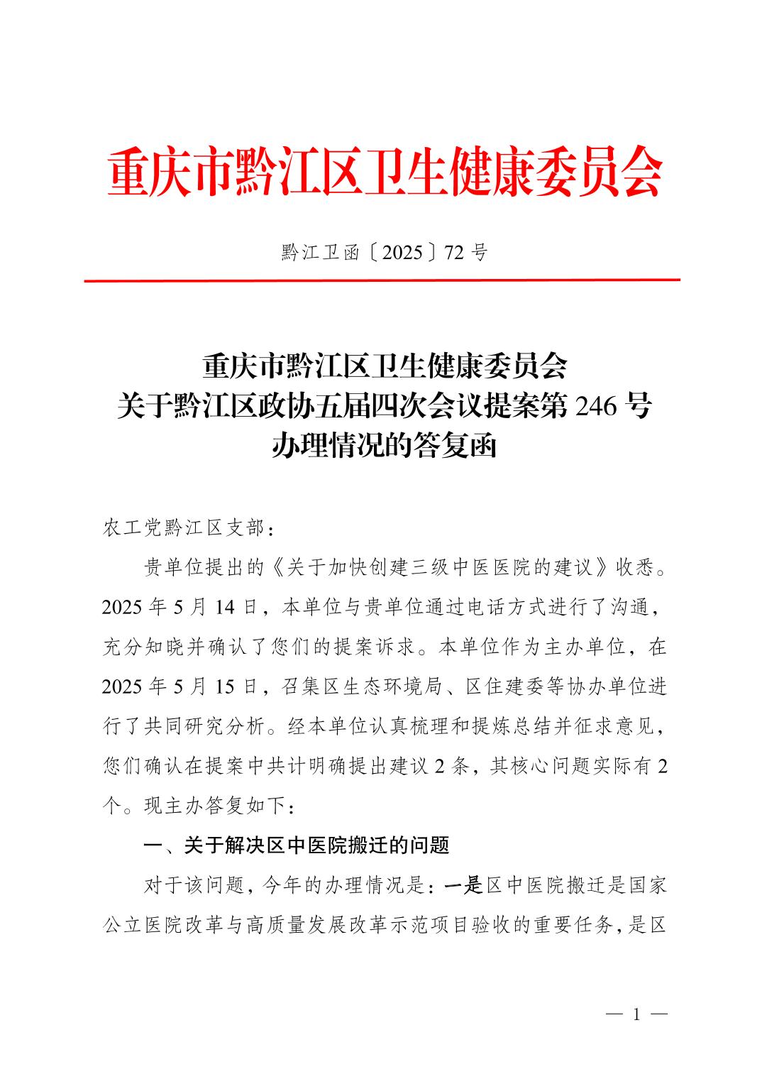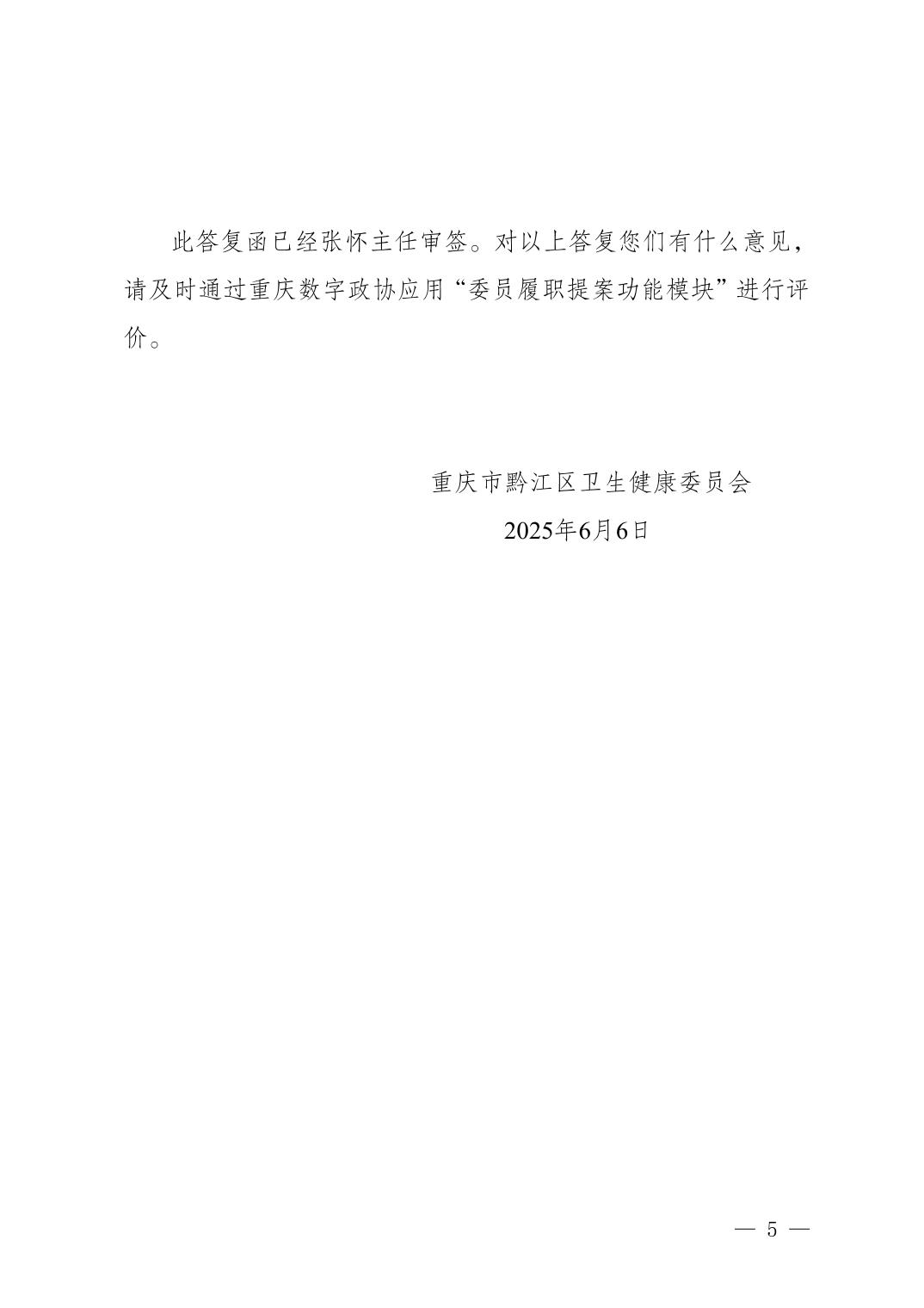 重慶市黔江區(qū)衛(wèi)生健康委員會(huì)關(guān)于黔江區(qū)政協(xié)五屆四次會(huì)議提案第246號(hào)辦理情況的答復(fù)函