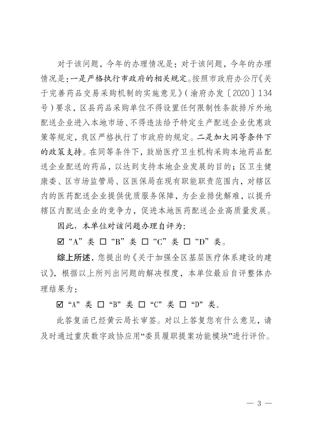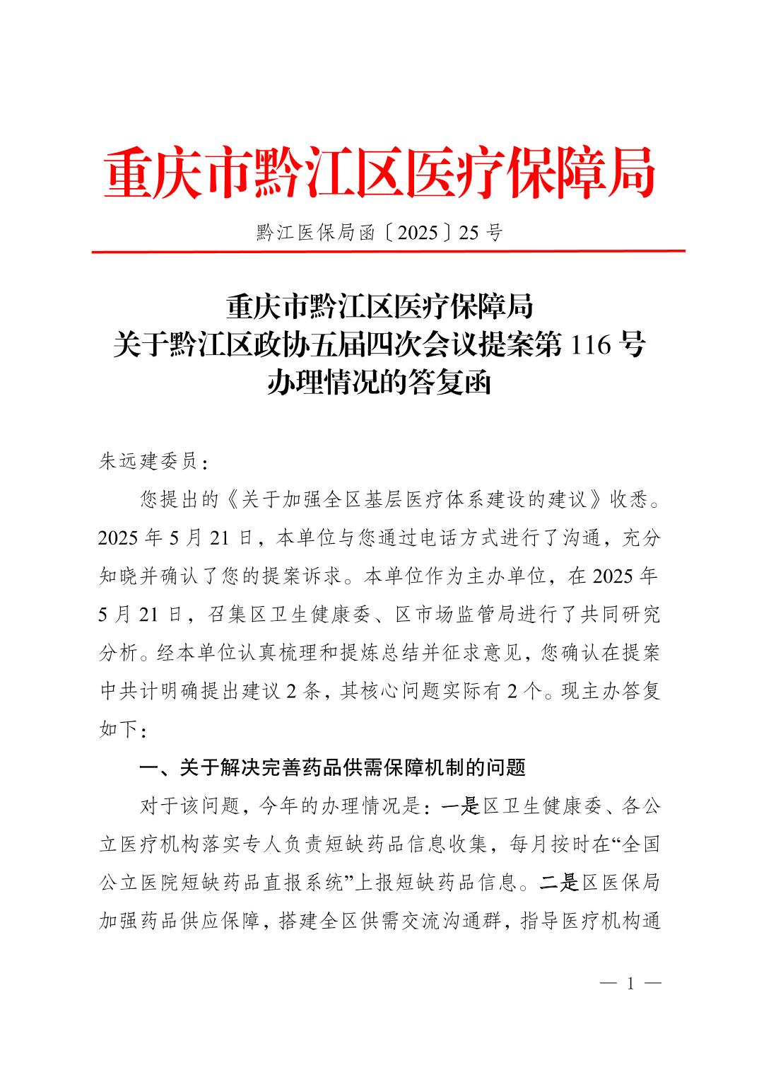 重慶市黔江區醫療保障局關于黔江區政協五屆四次會議提案第116號辦理情況的答復函